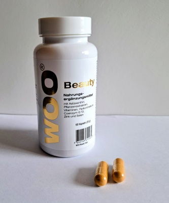 Nahrungsergänzungsmittel mit Astaxanthin, Pflanzenextrakten, Vitaminen, Hyaluronsäure, Coenzym Q 10, Zink und Selen